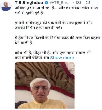 1. कड़ी सजा की मांग: पूर्व उपमुख्यमंत्री टीएस सिंहदेव ने भावुक पोस्ट साझा करते हुए इसे अंबिकापुर के लिए काला दिन बताया और अपराधियों को तत्काल फांसी देने की मांग की।