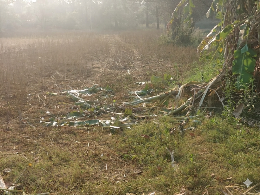 जानकारी के मुताबिक, जनपद पंचायत कार्यालय के समीप स्थित एक फार्म हाउस में बुधवार सुबह लगभग 3 से 4 बजे के बीच तीन जंगली हाथी फेंसिंग तोड़कर घुस आए। खेत में कटाई के बाद गेहूं की फसल थ्रेसिंग के लिए रखी गई थी, जिसे हाथियों ने न केवल खाया बल्कि बुरी तरह रौंद डाला। अनुमान जताया जा रहा है कि इस हमले में करीब 25 से 30 क्विंटल गेहूं और केले के पौधों का भारी नुकसान हुआ है।
