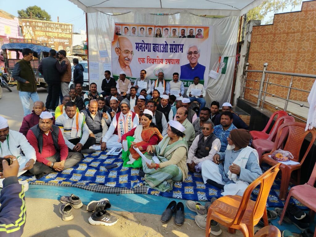 रामानुजगंज: ‘मनरेगा बचाओ संग्राम’ को लेकर गांधी चौक पर कांग्रेसियों का एक दिवसीय उपवास